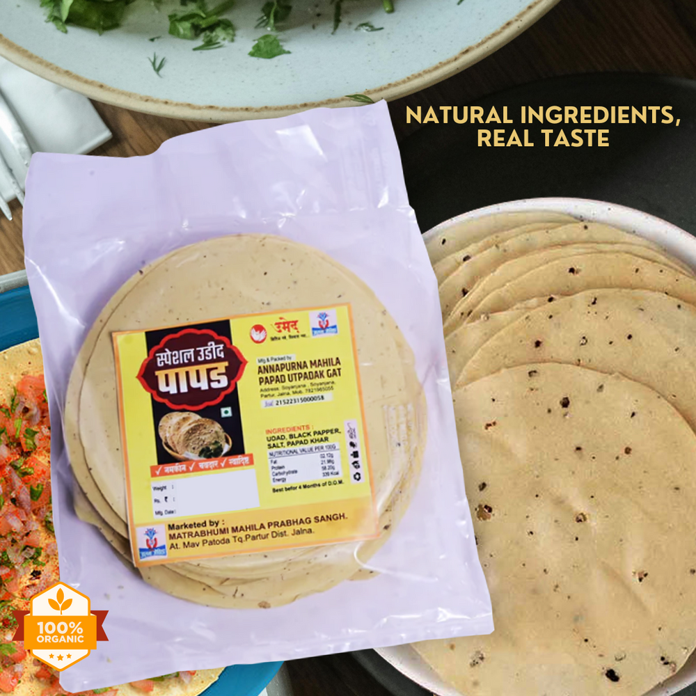 महाराष्ट्रातील जालना येथील अन्नपूर्णा पापड उत्पादक समूह बचत गटाने प्रेमाने हाताने बनवलेल्या अन्नपूर्णा उडीद पापडाची अस्सल चव चा अनुभव घ्या. उडीद पापडचा हा 100-ग्रॅम पॅक उत्कृष्ट नैसर्गिक घटकांपासून बनविला गेला आहे, ज्यामुळे शाकाहारी आणि मांसाहारी दोन्ही पदार्थांना पूरक असा निरोगी आणि स्वादिष्ट नाश्ता मिळेल. कृत्रिम रंग, फ्लेवर्स आणि संरक्षकांपासून मुक्त असलेले हे पापड शुद्ध आणि पारंपारिक स्वयंपाकाचा अनुभव देतात.