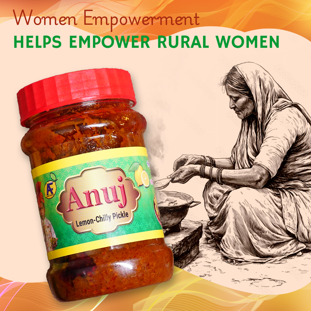 - ग्रामीण उपजीविकेचे समर्थन करते: अनुज फूड्स लिंबू मिरचीचे लोणचे निवडून, तुम्ही अंबड, जालना येथील ग्रामीण महिला कारागिरांच्या उपजीविकेचे समर्थन करता, त्यांना शाश्वतपणे उदरनिर्वाहासाठी सक्षम बनवता.