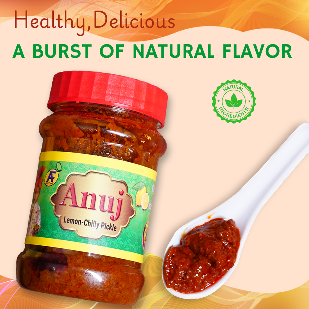 - नैसर्गिक घटक: काळजीपूर्वक निवडलेल्या नैसर्गिक घटकांनी बनवलेले, अनुज फूड्स लिंबू मिरचीचे लोणचे हे कृत्रिम स्वाद आणि संरक्षकांपासून मुक्त आहे, जे एक पौष्टिक आणि अस्सल चव अनुभव सुनिश्चित करते.
