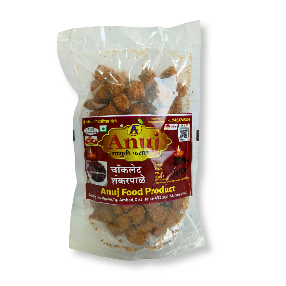 Introducing ANUJ FOODS Shankarpale, Chocolate Flavour, a delectable and crunchy Maharashtrian snack crafted with care by the dedicated women of the Bhagini Nivedita Self Help Group from Ambad Taluka, Jalna district, Maharashtra. Established in 2020, this self-help group has been producing high-quality, homemade snacks that celebrate traditional flavors with a modern twist. Made from 100% natural ingredients and free from artificial flavours, our Chocolate Flavour Shankarpale is the perfect treat for festive occasions like Diwali or as a delightful everyday snack. Each bite offers a unique blend of rich chocolate taste and the classic crunch that makes Shankarpale a beloved snack across Maharashtra.