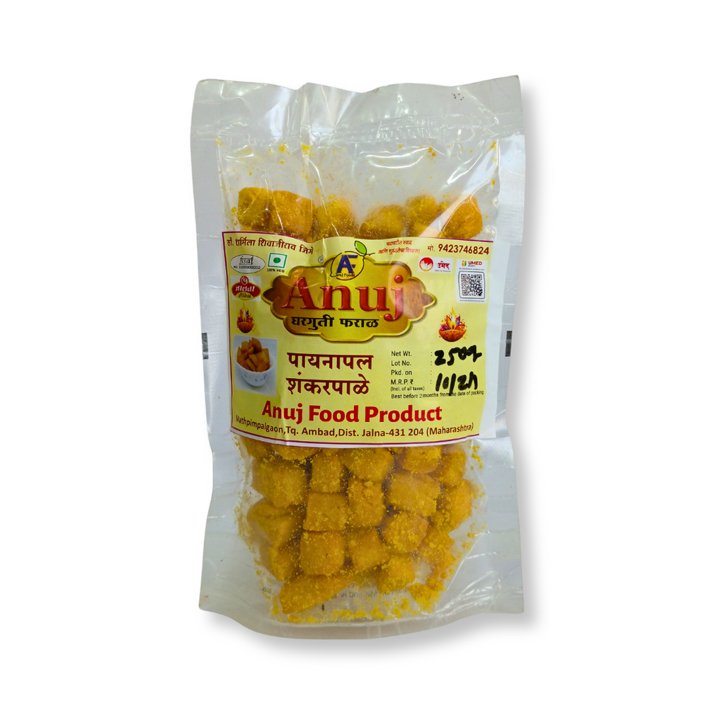 Introducing ANUJ FOODS Pineapple Flavour Shankarpale, a unique twist on the traditional Maharashtrian snack. Infused with the tangy sweetness of pineapple, this Diwali special treat is handmade with care by the talented women of the Bhagini Nivedita Self Help Group from Ambad Taluka, Jalna district. Made with 100% natural ingredients and no artificial flavors, ANUJ FOODS Shankarpale offers the perfect balance of taste and tradition. Whether you're hosting festive gatherings or simply enjoying a snack, this crunchy delight will leave a lasting impression.