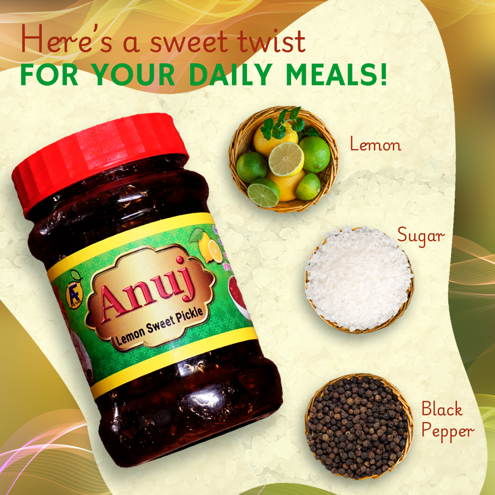 ANUJ FOODS Sweet Lemon Pickle च्या अप्रतिम चवीने तुमचा जेवणाचा अनुभव वाढवा. आताच UmedMart वर खरेदी करा आणि ग्रामीण कारागिरांना आणि सांस्कृतिक वारशाचे समर्थन करत महाराष्ट्रातील अस्सल स्वादांचा आनंद घ्या!