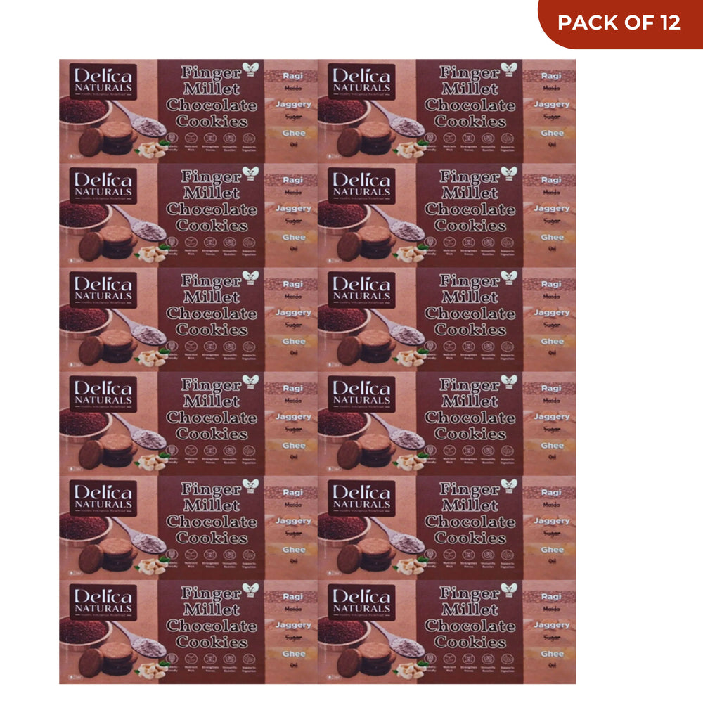 DELICA NATURALS Ragi (Nachani) Chocolate Cookies, Value Pack of 12, Stri Shakti SHG, Made by Jaggery & Ghee, No Maida, No Oil, No Sugar, Pack of 100 gm