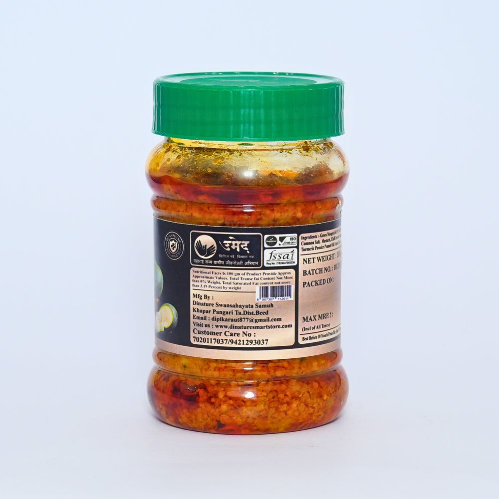 Introducing Mango Pickle from Dinature SHG, a delightful and tangy handmade pickle crafted with care by artisans from Beed, Maharashtra. Made with raw mangoes and traditional spices, this Mango Pickle delivers a rich and authentic flavor that will elevate your meals. It is created using the highest quality ingredients, offering you a homemade taste that will remind you of the traditional flavors of Maharashtra. Packed in a 200gm jar, this pickle is a perfect companion to dal, rice, parathas, or any dish that could use an extra burst of spice and flavor.