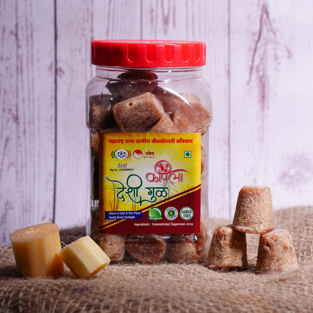 कराड, महाराष्ट्रातील कपिलेश्वर महिला स्वयं सहायता समुहच्या कुशल महिलांनी तुमच्यासाठी आणलेल्या कपिला शुद्ध देशी गुल गुळाच्या क्यूब्सच्या शुद्ध, अपरिष्कृत गोडपणाचे अनावरण करा. प्रत्येक 500gm जार पारंपारिक भारतीय गुळाच्या चांगुलपणाने भरलेले आहे, कोणत्याही रसायनांशिवाय किंवा कृत्रिम पदार्थांशिवाय बनवलेले आहे.