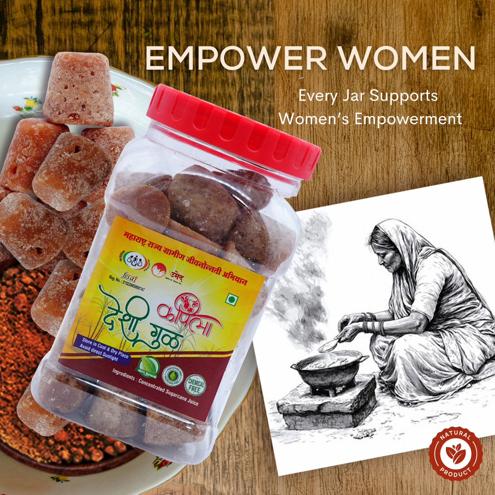 कपिला गुळाच्या क्यूब्सच्या प्रत्येक खरेदीसह, तुम्ही या उत्पादनामागील महिला कारागिरांच्या सक्षमीकरणासाठी थेट योगदान देता. तुमच्या पाठिंब्यामुळे त्यांच्या कुटुंबांचे जीवनमान उंचावण्यास आणि महाराष्ट्रातील ग्रामीण समुदायांना बळकट करून स्थिर उत्पन्न मिळण्यास मदत होते.