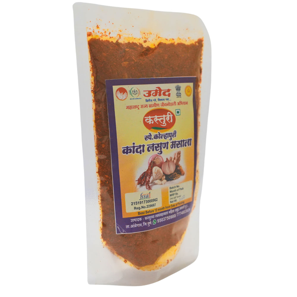 Discover the rich and flavorful Kasturi SP Kolhapuri Kanda Lasun Masala, expertly handcrafted by Kasturba Mahila Bachat Gat from Avsari Budruk, Ambegaon, Manchar, Pune. This traditional spice blend is renowned for its deep, smoky flavors and robust aroma, making it an essential ingredient in authentic Kolhapuri cuisine. Awarded 1st rank by RajMata Jijau Mahila, this masala is completely free from artificial preservatives and chemicals, ensuring a safe and natural culinary experience.