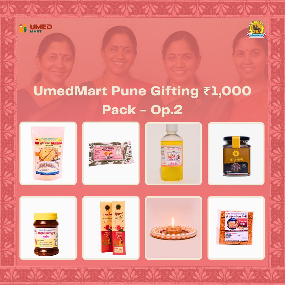 Celebrate this festive season with the UmedMart Gifting Combo Pack (Option 2) UmedMart Gifting Combo Pack, a premium festive hamper that includes 8 carefully selected products handmade by women Self-Help Groups (SHGs) across Maharashtra. This thoughtfully curated hamper combines authentic flavors, natural wellness, and handcrafted décor, making it an ideal choice for Diwali, Ganesh Chaturthi, weddings, or corporate gifting. Every purchase directly supports rural livelihoods and women empowerment.