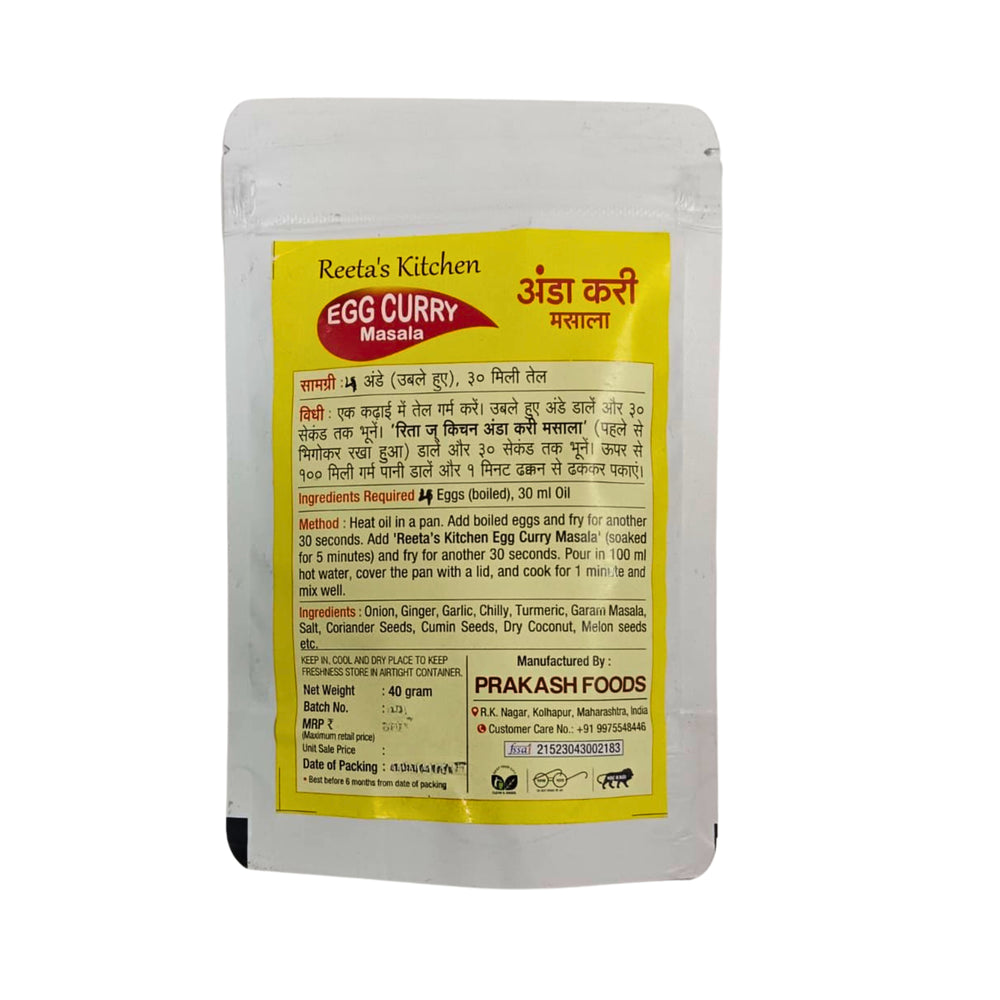 REETA"S KITCHEN Egg Curry Masala, Hirkani SHG, Made by Natural Ingredients, No Artificial Chemicals, Pack of 40 gm