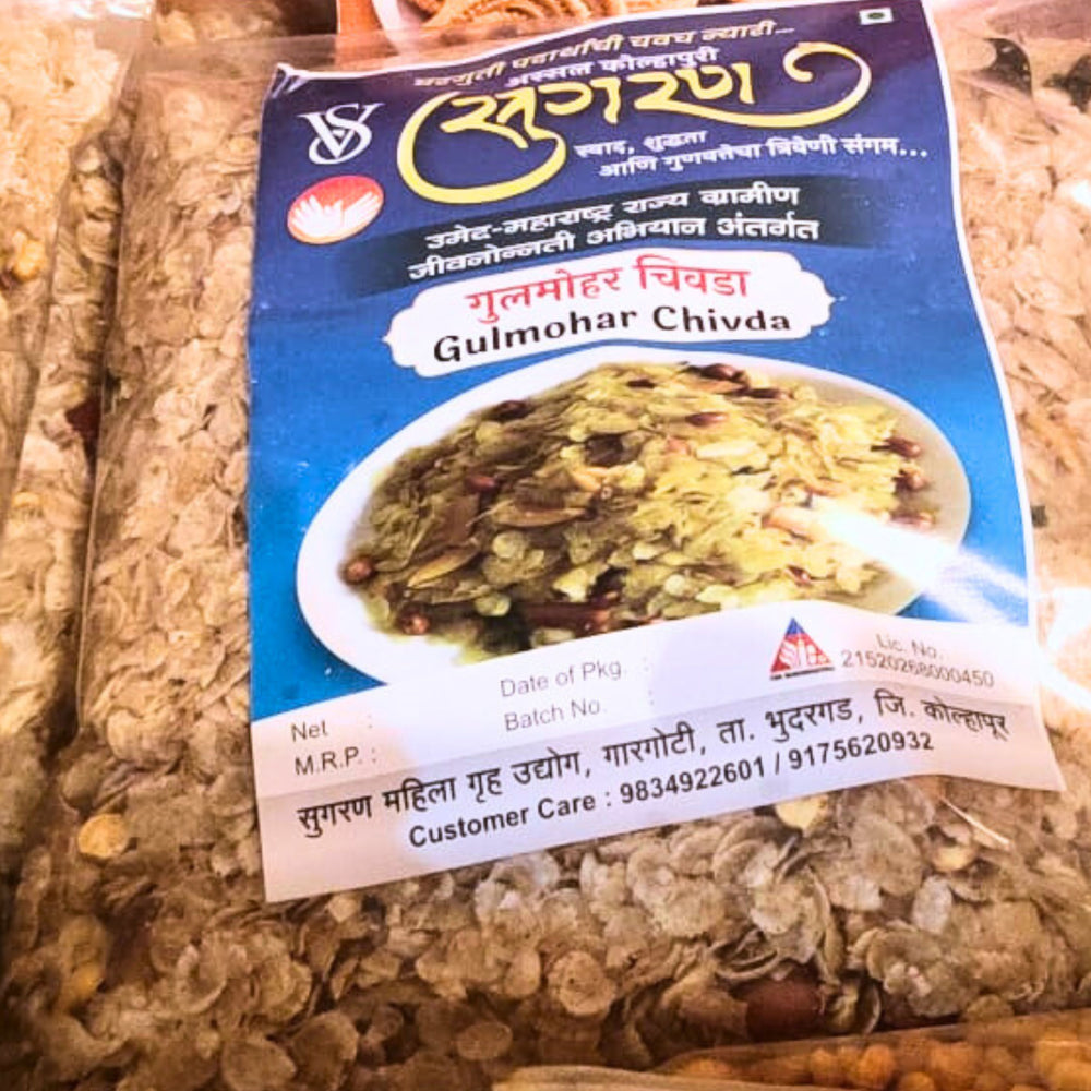 Bring home SUGARAN Gulmohar Chivada – a handmade snack from Kolhapur that blends tradition, taste, and nutrition. Every purchase supports SHG women artisans and preserves authentic heritage.
