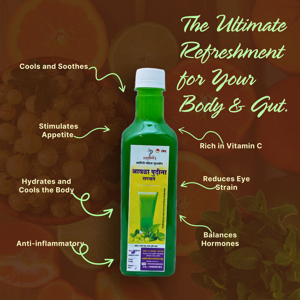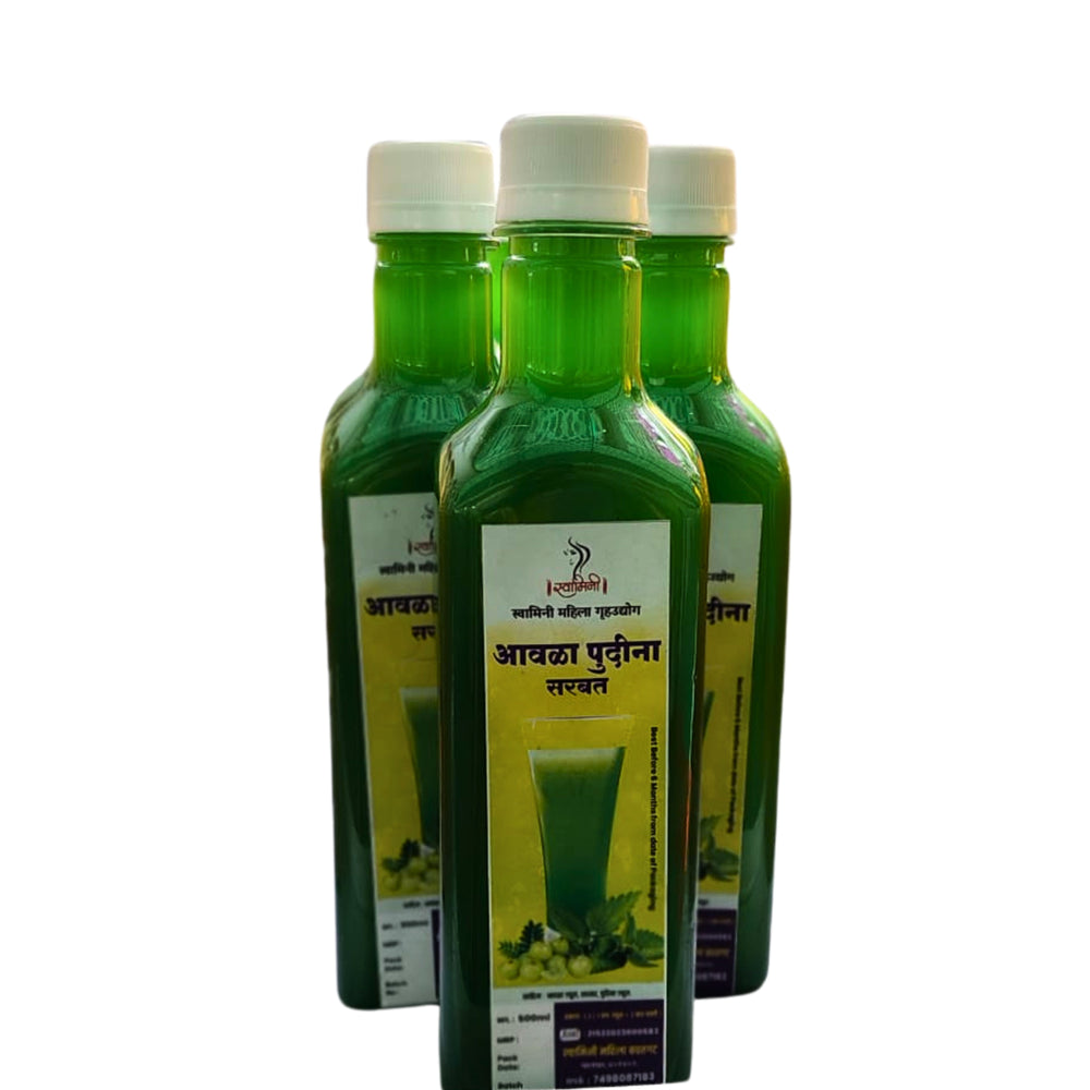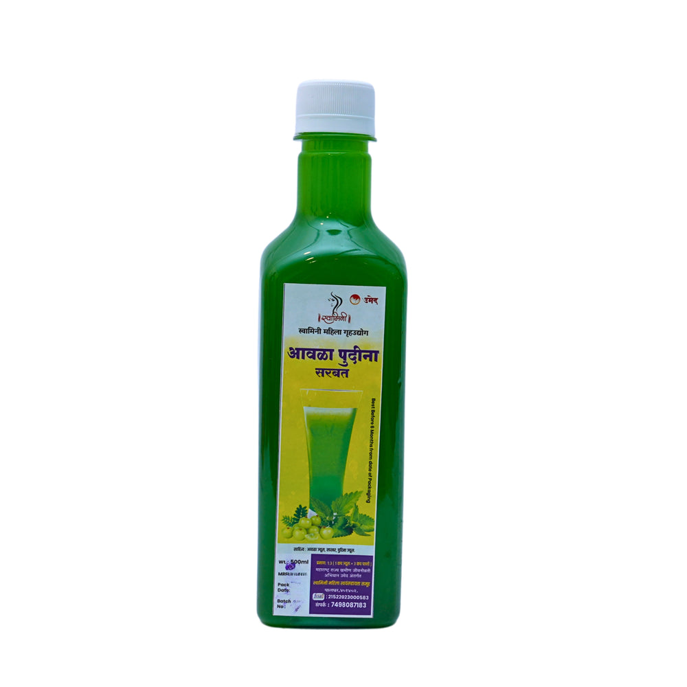Amla Pudina Sharbat is a refreshing herbal drink prepared by the women of Swamini SHG from rural Maharashtra. Made using avala (Indian gooseberry) and pudina (mint), this sharbat follows traditional preparation practices that focus on natural taste, balance, and purity. It is designed as a cooling and refreshing beverage suitable for regular consumption, especially during warmer seasons.