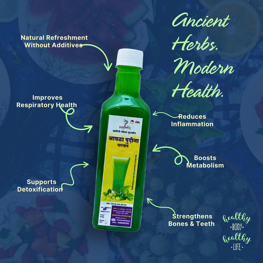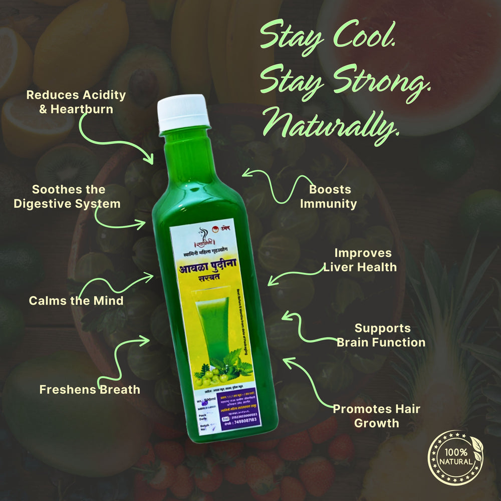Enjoy traditional refreshment with Amla Pudina Sharbat by Swamini SHG. Order now from UmedMart.com and support women-led self-help groups from rural Maharashtra.