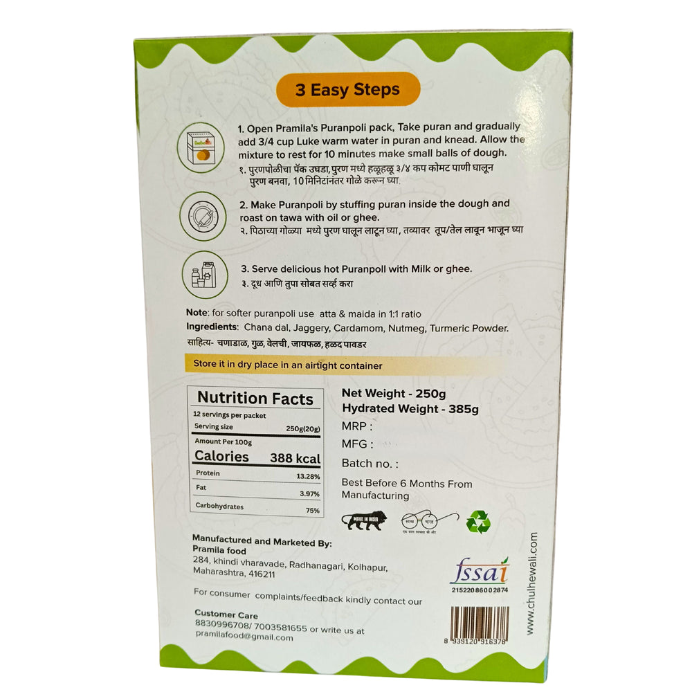CHULHEWALI Puran Poli Premix, Durgamata SHG, Natural, Chemical Free, Pack of 250 gm