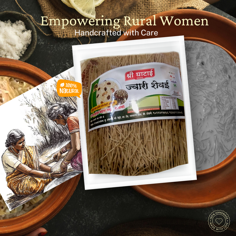Discover the wholesome goodness of GHATAIDEVI SHG Jowar Shevai, a product crafted with care and tradition by the dedicated women of the Shree Ghatai Devi Women's Group from Maharashtra. This 200 gm pack of Jowar Shevai is made using only natural ingredients, with no maida, ensuring a healthy and nutritious addition to your meals. The Shree Ghatai Devi Women's Group, established on October 10, 2022, is a self-help group comprising 13 women committed to producing high-quality, handmade shevai in a variety of flavors. Each pack not only represents the rich cultural heritage of rural Maharashtra but also supports sustainable livelihoods and empowers women in the community.