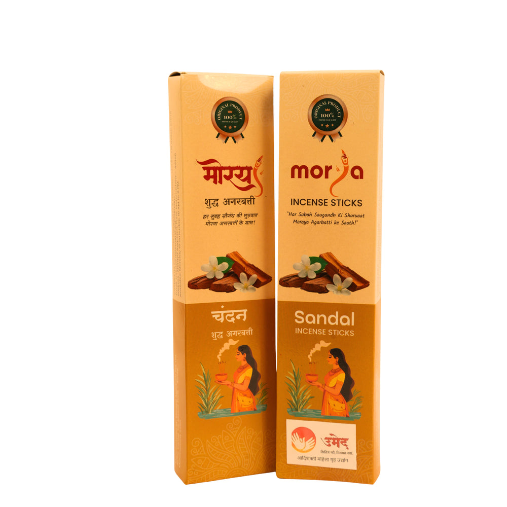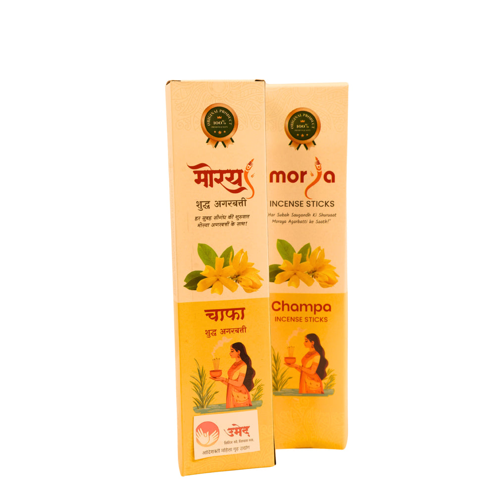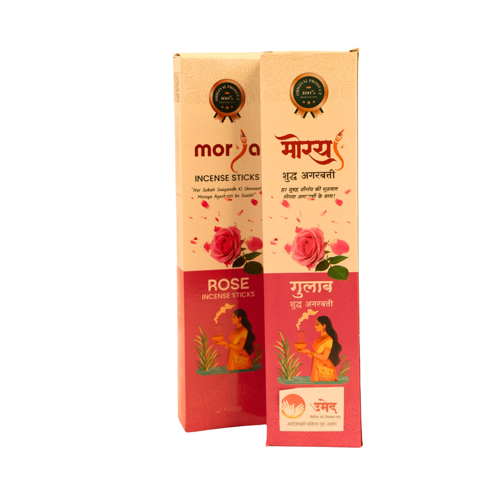 Moraya Pure Agarbatti – Gulab, Kasturi, Champa & Chandan (60 sticks) is a premium handmade incense crafted by the women of Adishakti Mahila Bachat Gat, Pune. Prepared using traditional methods, these incense sticks are free from artificial fragrances and harmful chemicals, ensuring a natural, soothing aroma without causing eye irritation or discomfort.