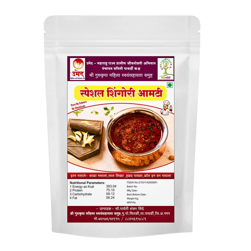 GURU KRUPA MASALE Special Shingori Amti is crafted with deep respect for heritage by the women of Guru Krupa SHG in Ahilyanagar. Each batch reflects the slow, patient rhythm of rural life—where ingredients are touched by hand, inspected with care, and prepared with the same sincerity that fills traditional Maharashtrian kitchens. This product carries the emotional weight of shared memories, community labour, and the pride of artisans who continue age-old practices passed from one generation to the next.