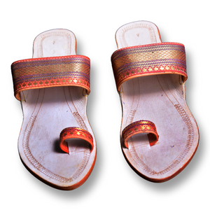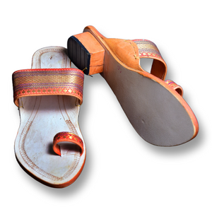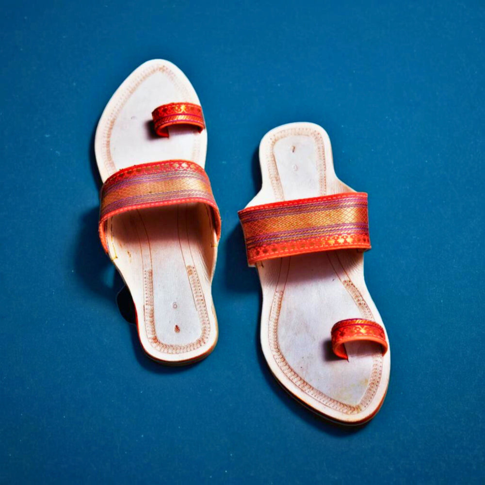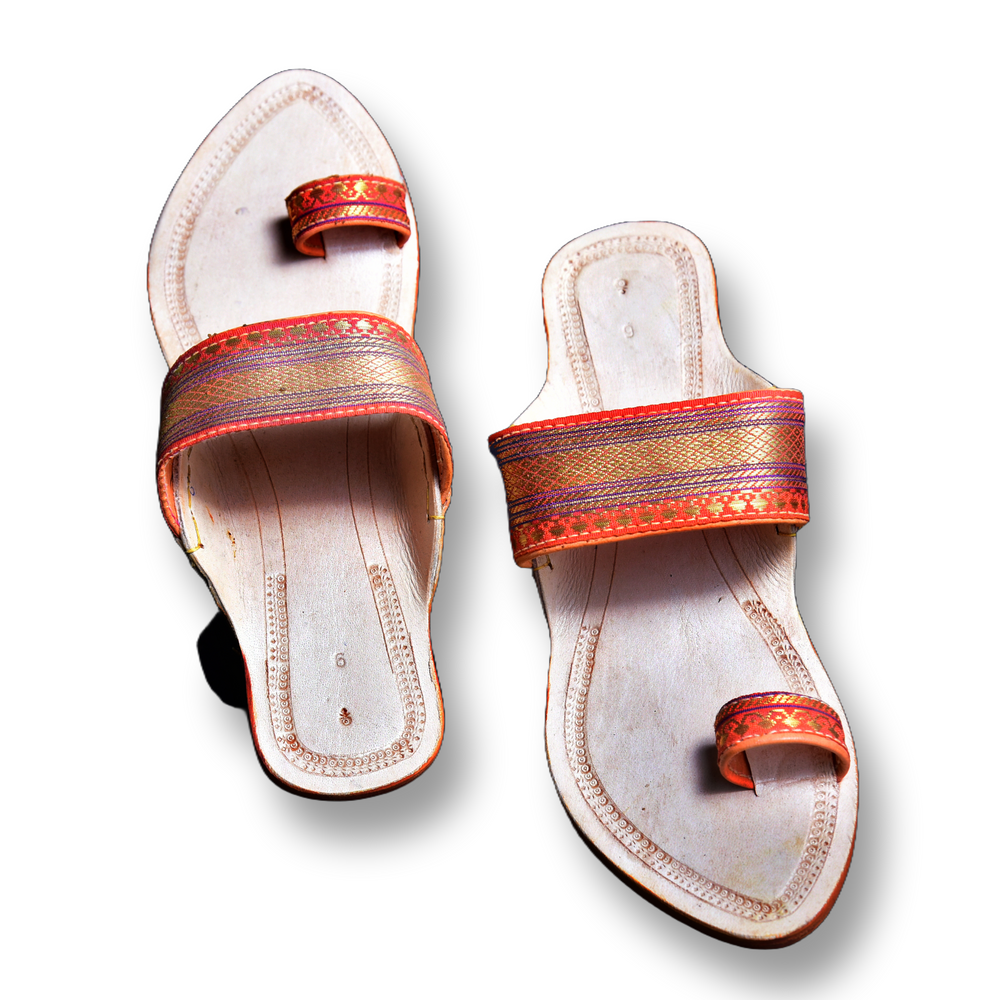 Kolhapuri Paithani Ladies Leather Footwear – Orange and White | Handcrafted by Kolhapuri Artisans