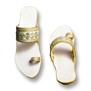 Kolhapuri Paithani Ladies Leather Footwear – Yellow and White | Handcrafted by Kolhapuri Artisans