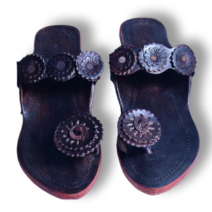 Step into tradition with a modern twist by purchasing the Kolhapuri Three Flowers Patta Ladies Leather Chappal in black, available exclusively on UmedMart.com. These beautifully handcrafted chappals not only provide exceptional style and comfort but also support the livelihoods of rural artisans and promote sustainable, eco-friendly fashion. By making a purchase, you are preserving Kolhapur’s rich cultural legacy and helping empower women artisans. Order your pair today and walk with pride in every step, knowing that your purchase makes a difference!