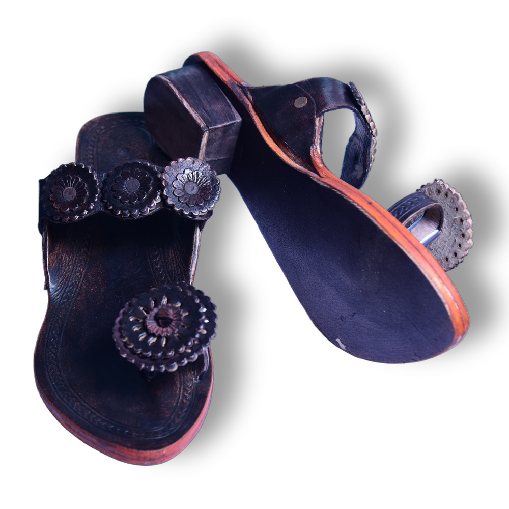 Kolhapuri Three Flowers Patta Ladies Leather Footwear – Black | Handcrafted by Kolhapuri Artisans