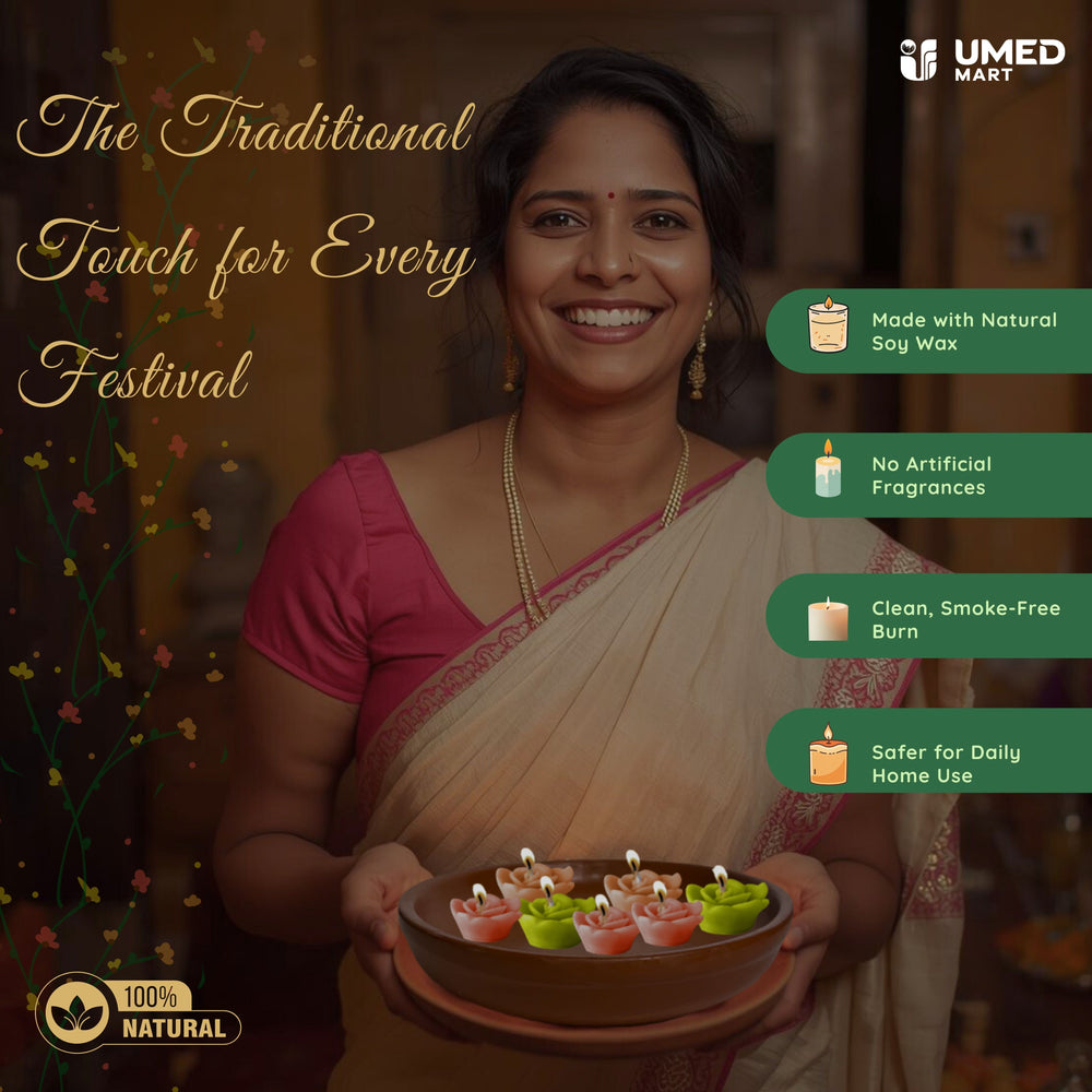 • Handcrafted Floral Candle: Made using traditional hand-poured wax techniques.Colorful Decorative Design: Bright, vibrant colors suitable for home décor and festive use.Long-Lasting Aroma: Soft floral fragrance that promotes relaxation and calmness.Clean-Burning Wax Blend: Smooth, consistent flame with minimal residue.Women SHG Product: Created by Mauli Mahila SHG, supporting rural livelihoods.