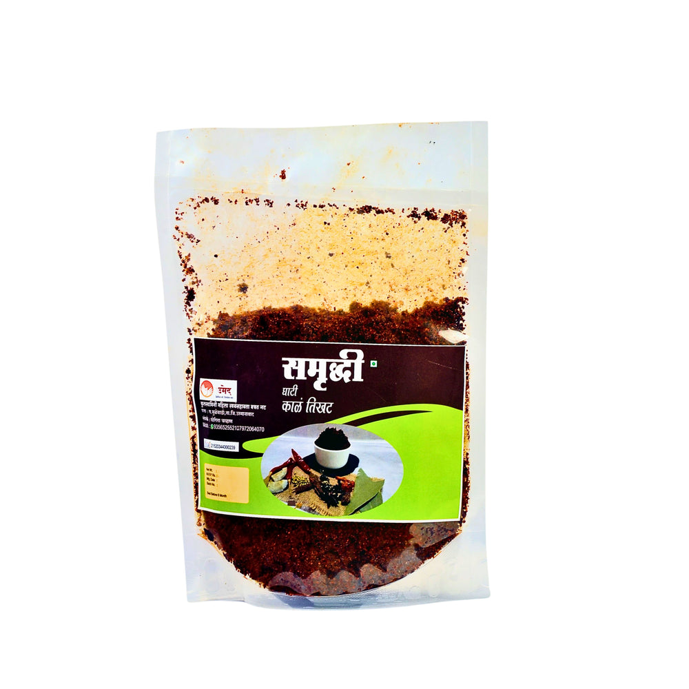 SAMRUDHI Samrudhi Kale Tikhat is lovingly crafted by the women of Kulswamini Swayam Sahayata Samuh SHG in Dharashiv. This handcrafted product brings together tradition, purity and pride, created in small batches where every piece is touched by hand. The artisans choose ingredients and materials carefully, work with focus and finish each unit as if it were meant for their own family. In every Pack of 500 g, you receive not only a product but also the grace, patience and emotional strength of rural women.