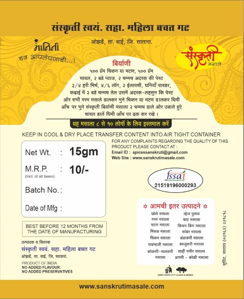 SANSKRUTI Biryani Masala,Made By Natural Ingredients,No Artificial flavour,pack of 15 gm