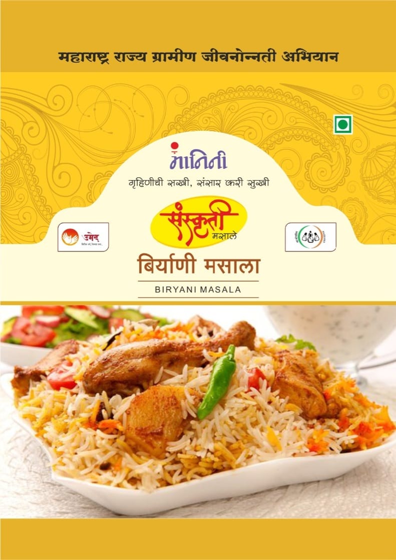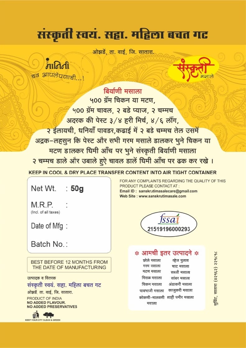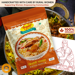 Indulge in the rich flavors of Maharashtra with Sanskruti Masala, a delightful blend meticulously crafted by Sankruti Svayam Sahayata Mahila Bachat Gat from the serene landscapes of Wai. Our Biryani Masala is a culinary gem, expertly prepared using natural ingredients sourced locally from the heart of Maharashtra.
