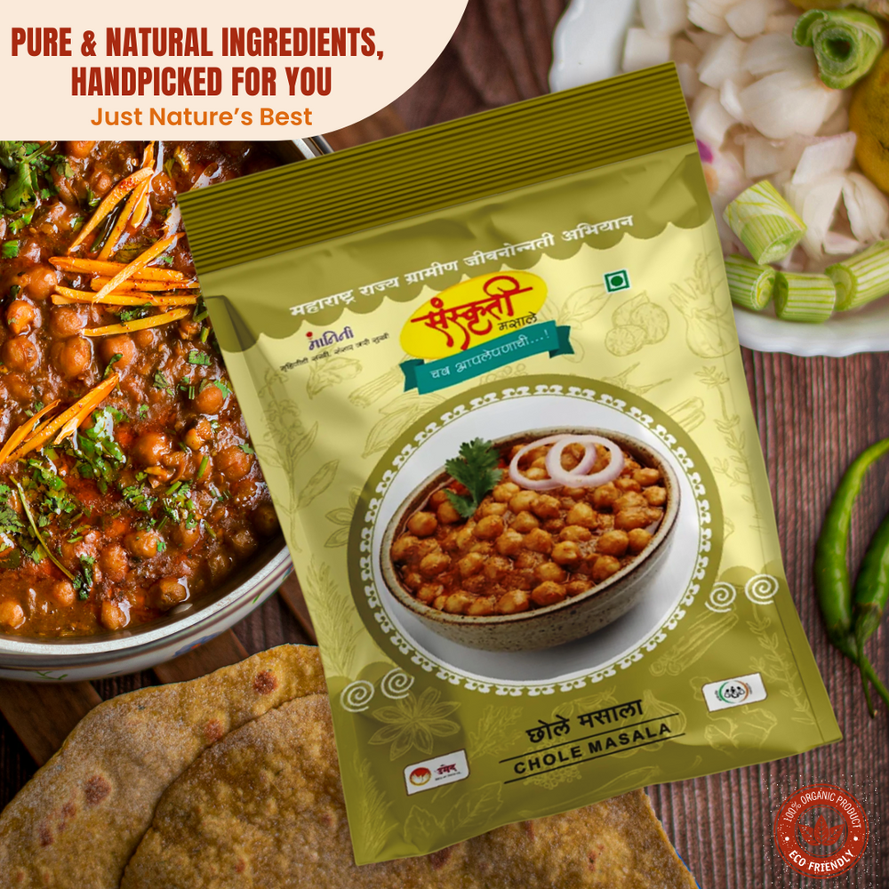 Experience the rich and aromatic flavors of Indian cuisine with Sanskruti Masala's Chole Masala. Made with natural ingredients and free from any artificial essence, this 50 pack of Chole Masala is a testament to the culinary expertise of Sankruti Svayam Sahayata Mahila Bachat Gat from Wai, Maharashtra.