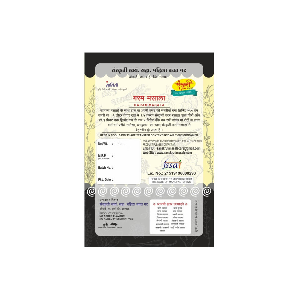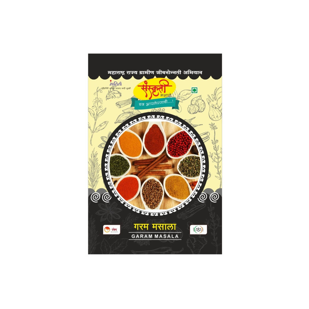 Elevate your culinary experience to new heights with Sanskruti Masala, a premium blend of Garam Masala meticulously crafted by Sankruti Svayam Sahayata Mahila Bachat Gat from the enchanting town of Wai, Maharashtra. Made with a selection of natural ingredients and free from any artificial essence, each 100gm pack encapsulates the rich and authentic flavors of Maharashtra's culinary heritage.