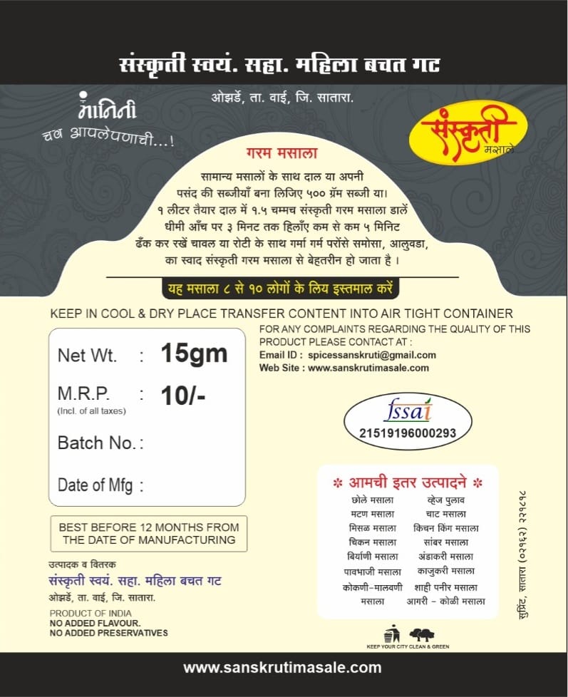 Elevate your culinary experience to new heights with Sanskruti Masala, a premium blend of Garam Masala meticulously crafted by Sankruti Svayam Sahayata Mahila Bachat Gat from the enchanting town of Wai, Maharashtra. Made with a selection of natural ingredients and free from any artificial essence, each 15gm pack encapsulates the rich and authentic flavors of Maharashtra's culinary heritage.