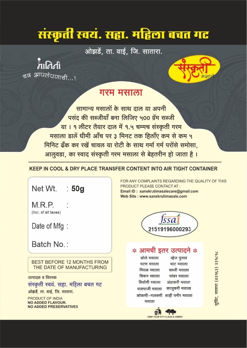 - Natural Ingredients: We believe in the purity of flavors. Sanskruti Masala contains only natural ingredients sourced locally from Maharashtra.