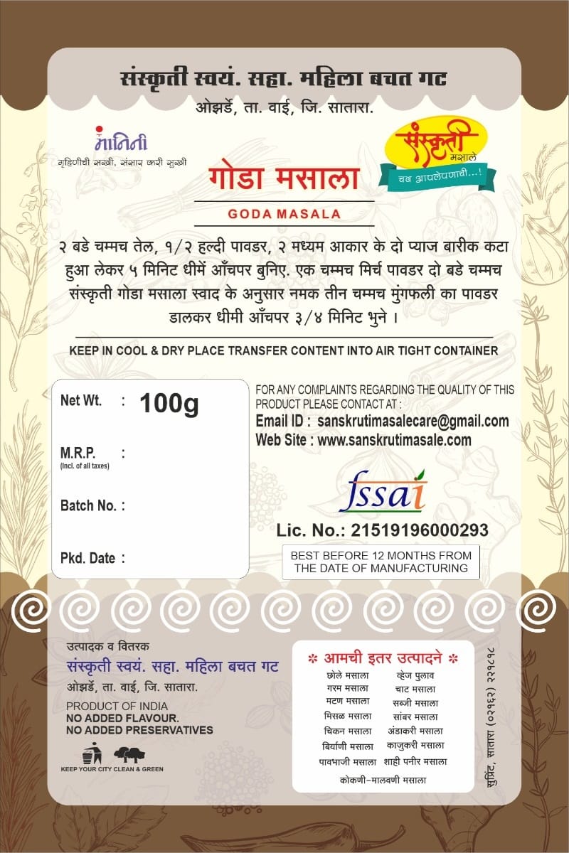 Experience the rich and aromatic flavors of Maharashtra with Sanskruti Masala's Goda Masala. Meticulously crafted by Sankruti Svayam Sahayata Mahila Bachat Gat from the picturesque town of Wai, Maharashtra, this premium blend captures the essence of traditional Indian spices.