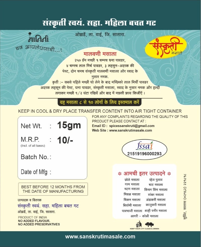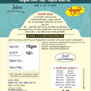 Discover the rich and exotic flavors of Malvani cuisine with Sanskruti Masala, a premium blend meticulously crafted by Sankruti Svayam Sahayata Mahila Bachat Gat from the heart of Wai, Maharashtra. Made with a blend of natural ingredients and free from any artificial essence, each 15gm pack encapsulates the vibrant and authentic taste of Malvani spices.
