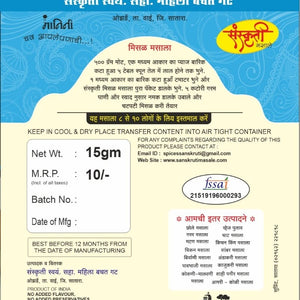 Transport your taste buds to the streets of Maharashtra with Sanskruti Masala, a premium blend of Misal Masala meticulously crafted by Sankruti Svayam Sahayata Mahila Bachat Gat from the vibrant town of Wai, Maharashtra. Made with a selection of natural ingredients and free from any artificial essence, each 15gm pack encapsulates the rich and authentic flavors of Maharashtra's culinary heritage.