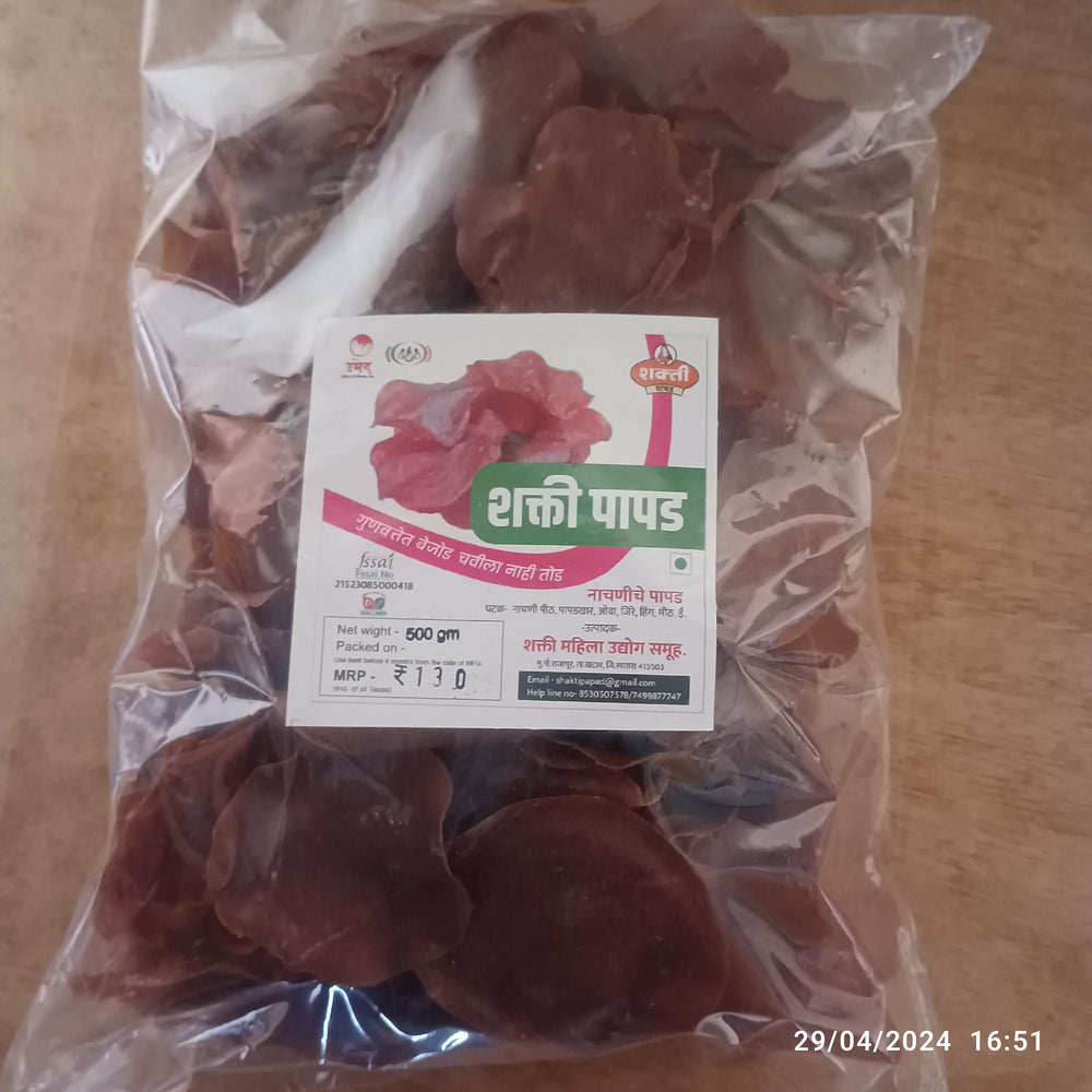 Indulge in the wholesome goodness of Shakti Ragi Papad, expertly handcrafted with natural ingredients and no artificial chemicals. Each pack contains 500 gm of ragi papad, offering a crunchy texture and delicious taste that embodies the essence of Maharashtra's culinary heritage.