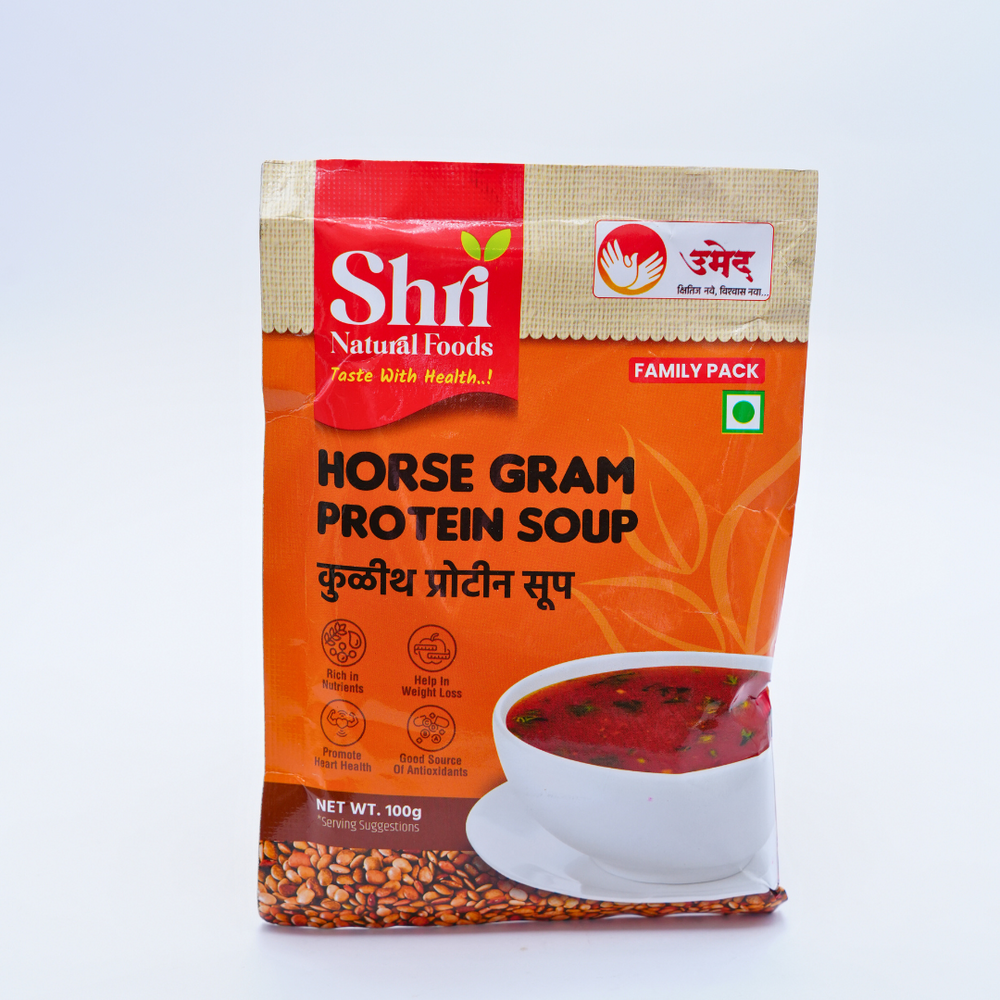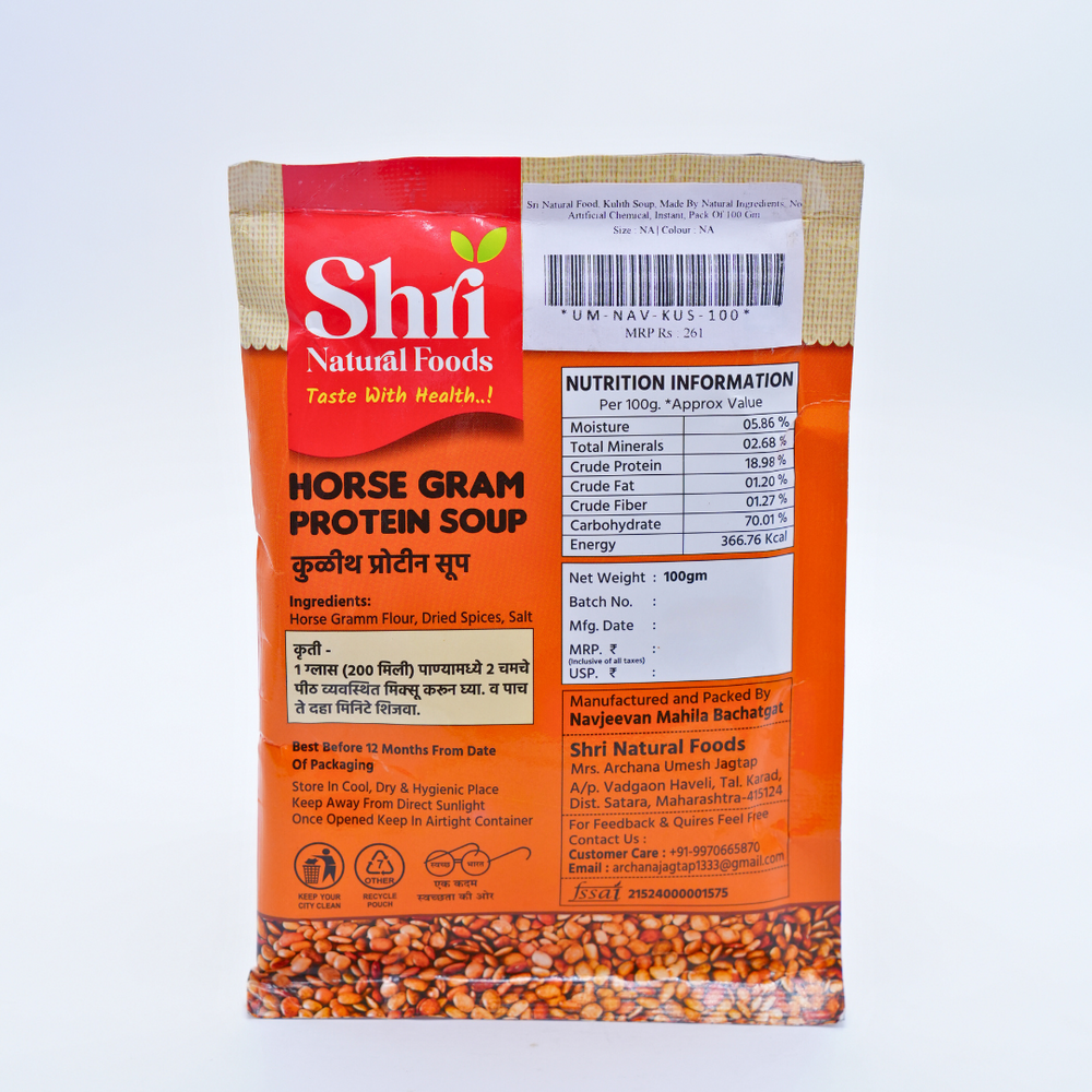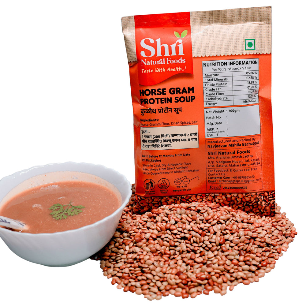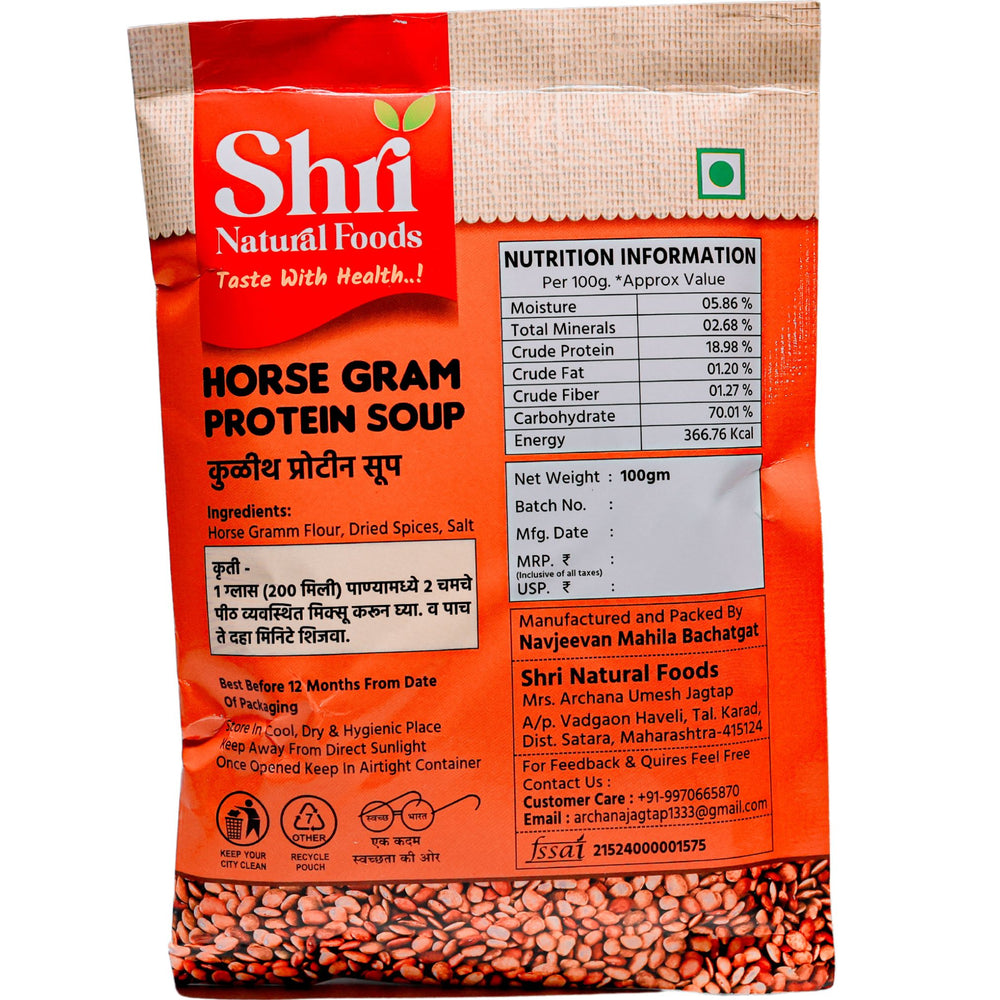 Shri Natural Foods Kulith (Horsegram) Protein Soup is an instant, healthy, and delicious meal option made from the finest natural ingredients by the dedicated women of NAVJIVAN SHG in Satara, Maharashtra. Known for its high nutritional value, Kulith (horsegram) is a traditional ingredient that has been cherished for generations. This instant soup is free from artificial chemicals and preservatives, ensuring that you enjoy a pure, nutritious meal or snack. With its rich flavor and numerous health benefits, this Kulith Protein Soup is the perfect choice for those looking to maintain a healthy lifestyle without compromising on taste.