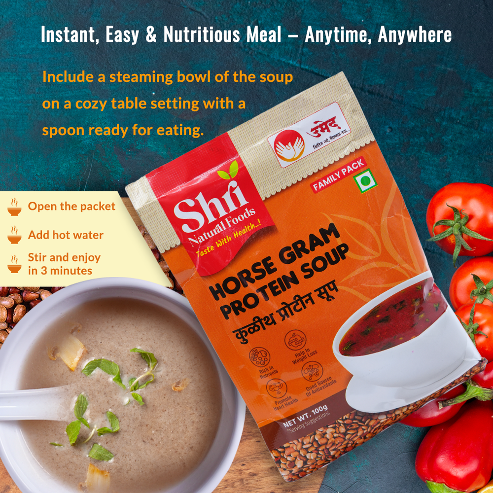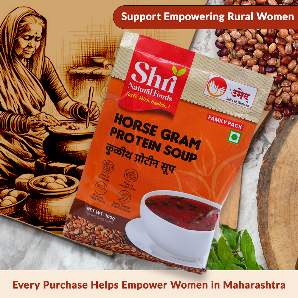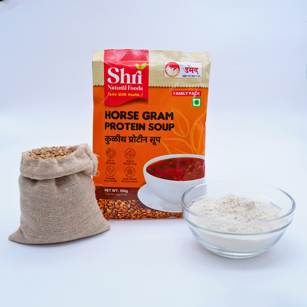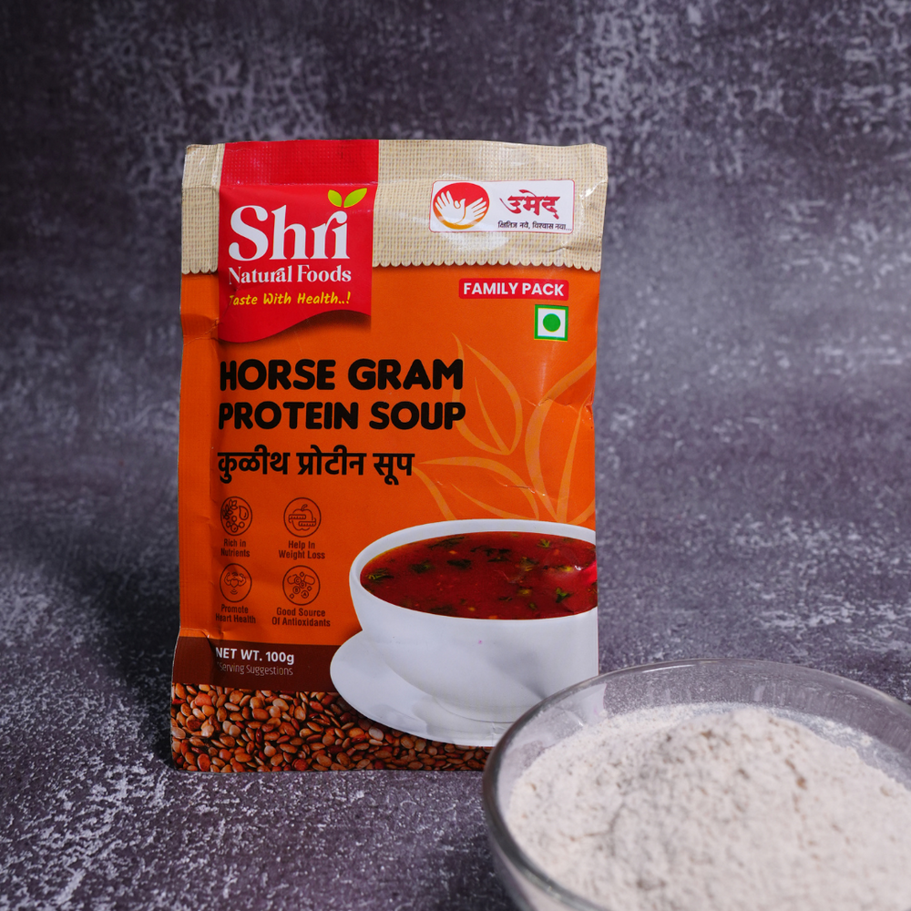 Shri Natural Foods Kulith (Horsegram) Protein Soup is an instant, healthy, and delicious meal option made from the finest natural ingredients by the dedicated women of NAVJIVAN SHG in Satara, Maharashtra. Known for its high nutritional value, Kulith (horsegram) is a traditional ingredient that has been cherished for generations. This instant soup is free from artificial chemicals and preservatives, ensuring that you enjoy a pure, nutritious meal or snack. With its rich flavor and numerous health benefits, this Kulith Protein Soup is the perfect choice for those looking to maintain a healthy lifestyle without compromising on taste.