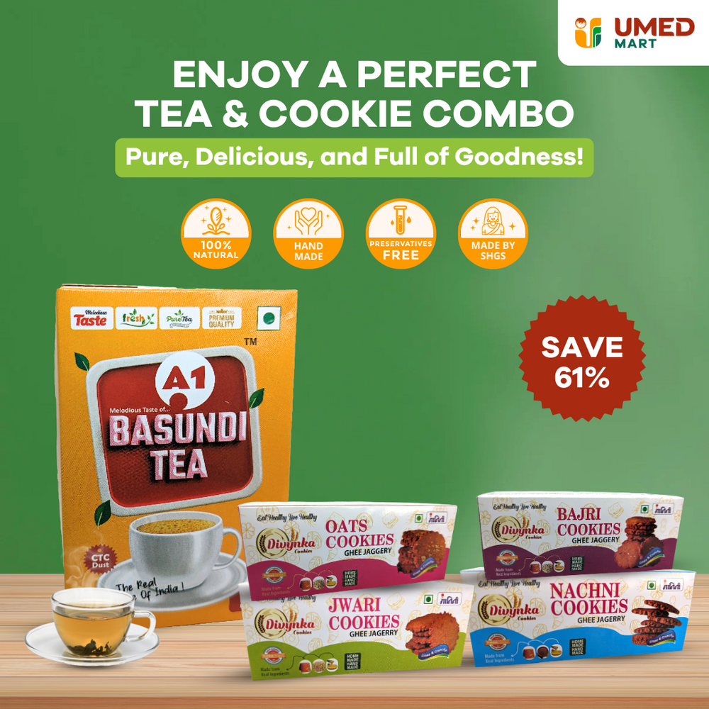 When you choose the Tea-time Combo Pack from UmedMart.com, you are investing in more than just a product; you are supporting a movement. UmedMart is a curated e-marketplace that connects you with handmade products crafted by Self-Help Groups (SHGs) across Maharashtra. Every purchase you make empowers rural women artisans, providing them with sustainable income opportunities while helping to preserve the cultural heritage of their communities. The Tea-time Combo Pack, featuring DIVYNKA Whole Grain Cookies and A1 BASUNDI Tea, is a celebration of flavour, health, and tradition, all in one package. Enjoy this guilt-free indulgence while making a difference in the lives of these talented women artisans.