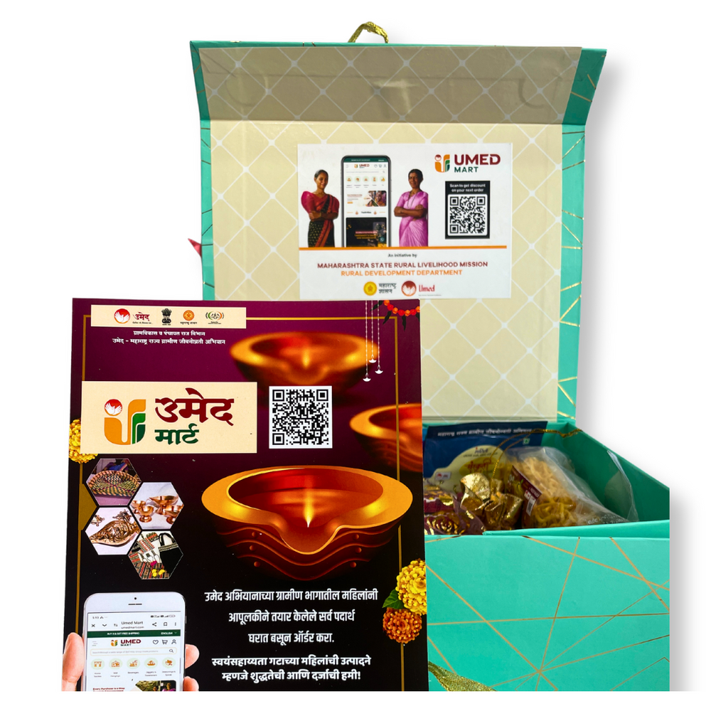 Celebrate Diwali with a unique and thoughtfully curated gift that supports rural livelihoods and showcases the rich traditions of Maharashtra. The UmedMart Diwali SHG Delight Kit is an exclusive blend of delicious treats, aromatic spices, and traditional essentials, all handcrafted by Self-Help Groups (SHGs) across Maharashtra. Each product in this kit reflects the dedication and passion of the artisans, making it the perfect gift for spreading joy and supporting community development this festive season.